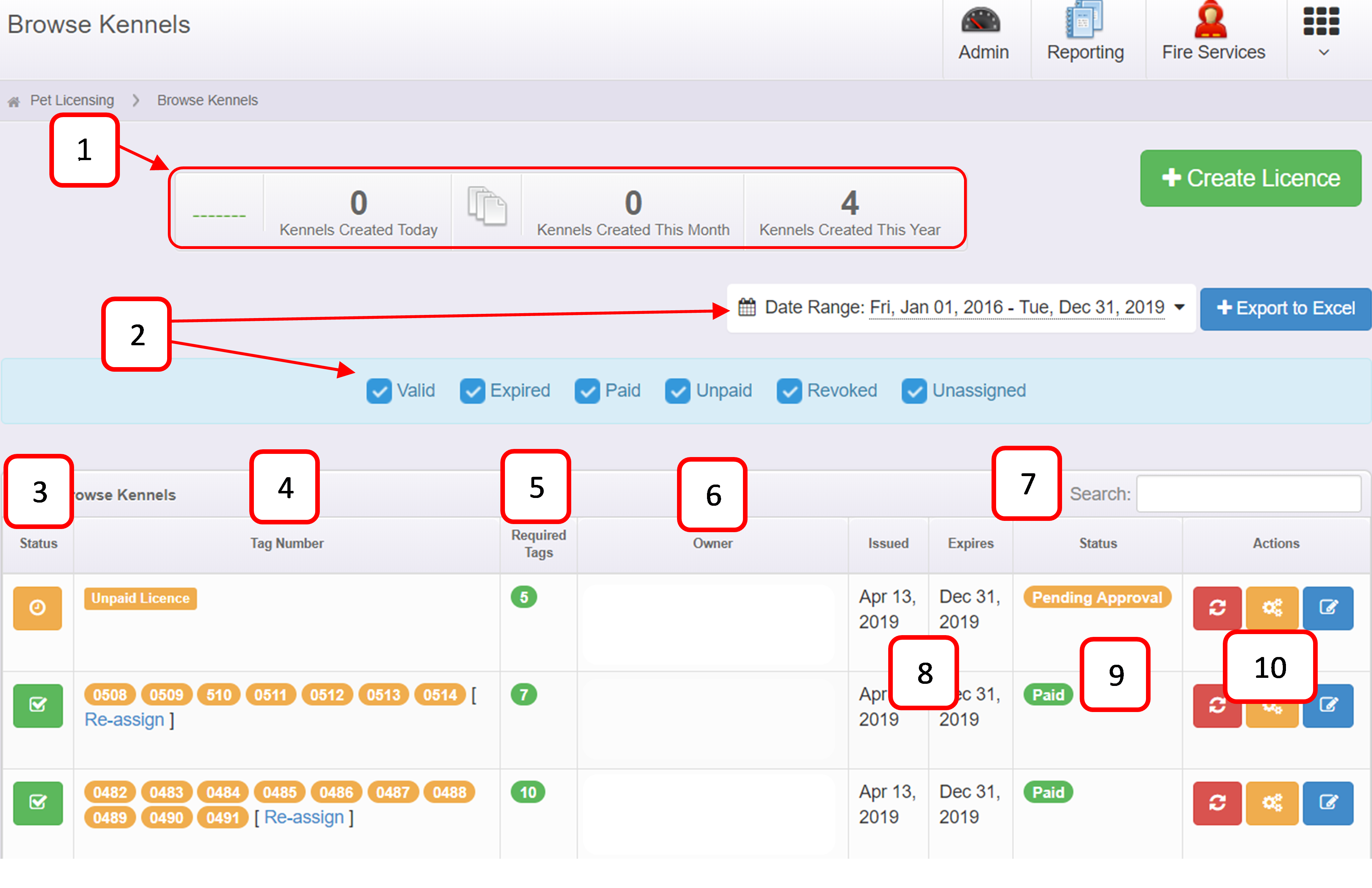 Quick view of licences created Today, This Month and This Year. Sort licences by date rage or based on status. Status – this allows you to “Hide” a pet, in the event that the pet passes away and the resident no longer requires a licence. Tag Number – ...